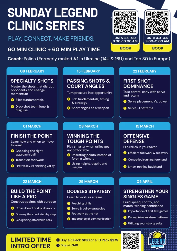 High-Performance Adult Clinic (3.5–4.0 USTA). Every Sunday at 8:00 am – 10:00 am
